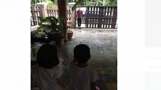 Kedua bocah kecil itu patuh pada perintah ayahnya. Mereka tetap berdiri di depan teras. Istrinya juga demikian.