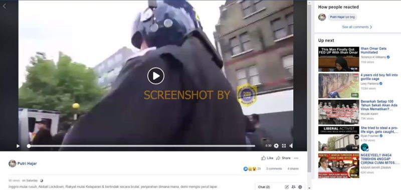 Jakarta, inikepri.com – Beredar sebuah video yang diunggah melalui Facebook tentang kerusuhan di Inggris akibat kebijakan lockdown. Dalam unggahan tersebut juga disebutkan rakyat yang mulai kelaparan lalu bertindak menjadi brutal dan melakukan penjarahan.