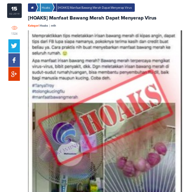 Pula, situs Kominfo juga telah memberikan stempel hoaks pada klaim tersebut. Pada jumat, 15 Februari 2019, melalui artikel berjudul “[HOAKS] Manfaat Bawang Merah Dapat Menyerap Virus” disebutkan bahwa informasi tersebut hanyalah mitos seperti yang dijelaskan oleh salah satu sumber National Onion Association (NOA). Sebuah organisasi yang mewakili petani, pedagang, eksporter, dan importer bawang merah di Amerika Serikat yang ada sejak 1913.