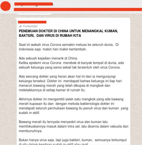 Baru-baru ini, beredar pesan berantai memuat informasi bahwa bawang merah diklaim ampuh mencegah penularan covid-19. Temuan itu berasal dari percobaan seorang dokter di Tiongkok terahdap bawang merah kepada pasien covid-19. Berikut secara lengkap narasinya: