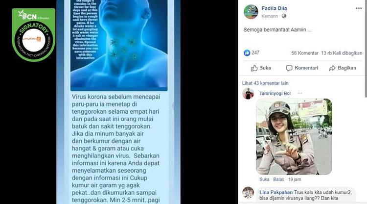 Batam, inikepri.com – Kabar tentang berkumur dan meminum air hangat dicampur garam serta cuka dapat menghilangkan virus corona atau Covid-19 beredar di media sosial. Kabar ini disebarkan akun Facebook Fadila Dila pada 15 Maret 2020.