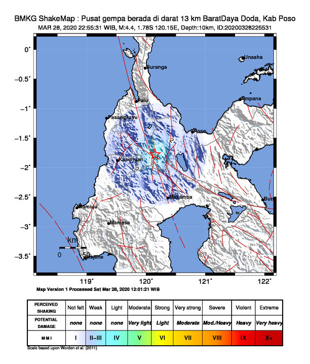 Lokasi 1.72 LS,120.14 BT (46 km Tenggara Sigi- Sulawesi Tengah), Kedalaman:10 Km, laporan Badan Meteorologi Klimatologi dan Geofisika (BMKG) gempa ini tidak berpotensi tsunami.