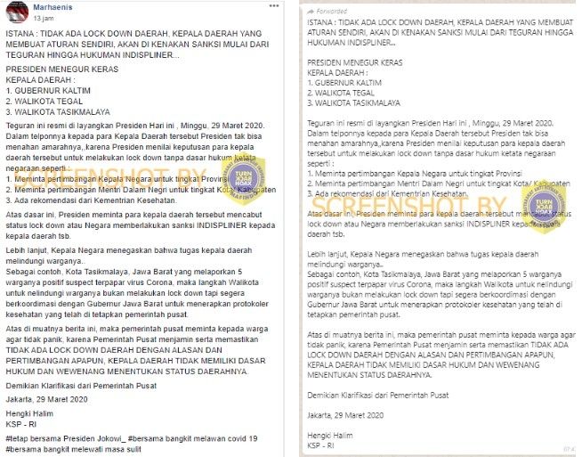 Informasi yang menyebut Presiden Jokowi menegur keras tiga kepala daerah karena menerapkan lockdown wilayah merupakan hasil masuk dalam kategori konten palsu.
