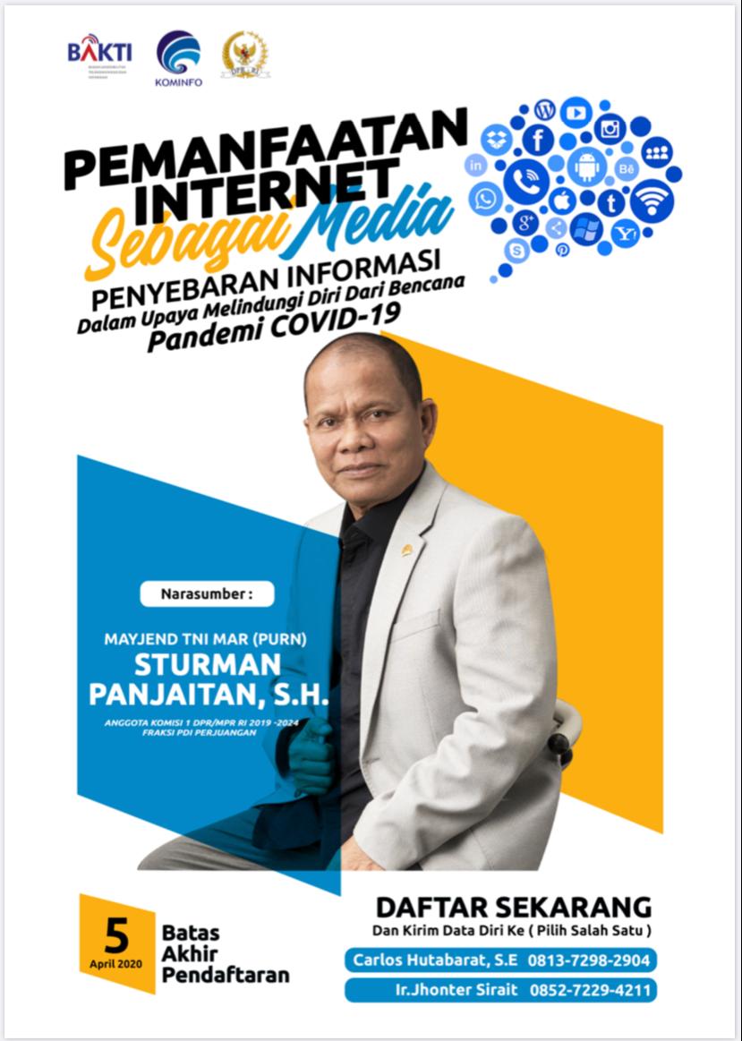 Agar pemanfaatan Internet lebih terarah ditengah pandemi ini, Mayjen. TNI, Mar,(Purn) Sturman Panjaitan, S.H. Anggota Komisi I DPR RI, menyelenggarakan seminar “Pemanfaatan Internet Sebagai Media Penyebaran Informasi Dalam Upaya Melindungi Diri Dari Bencana Pandemi Covid-19”.