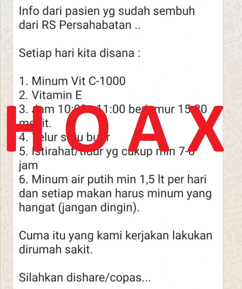 Klaim pasien COVID-19 di RS Persahabatan sembuh dengan berjemur sinar matahari langsung, mengkonsumsi telur hingga vitamin C tidak benar.