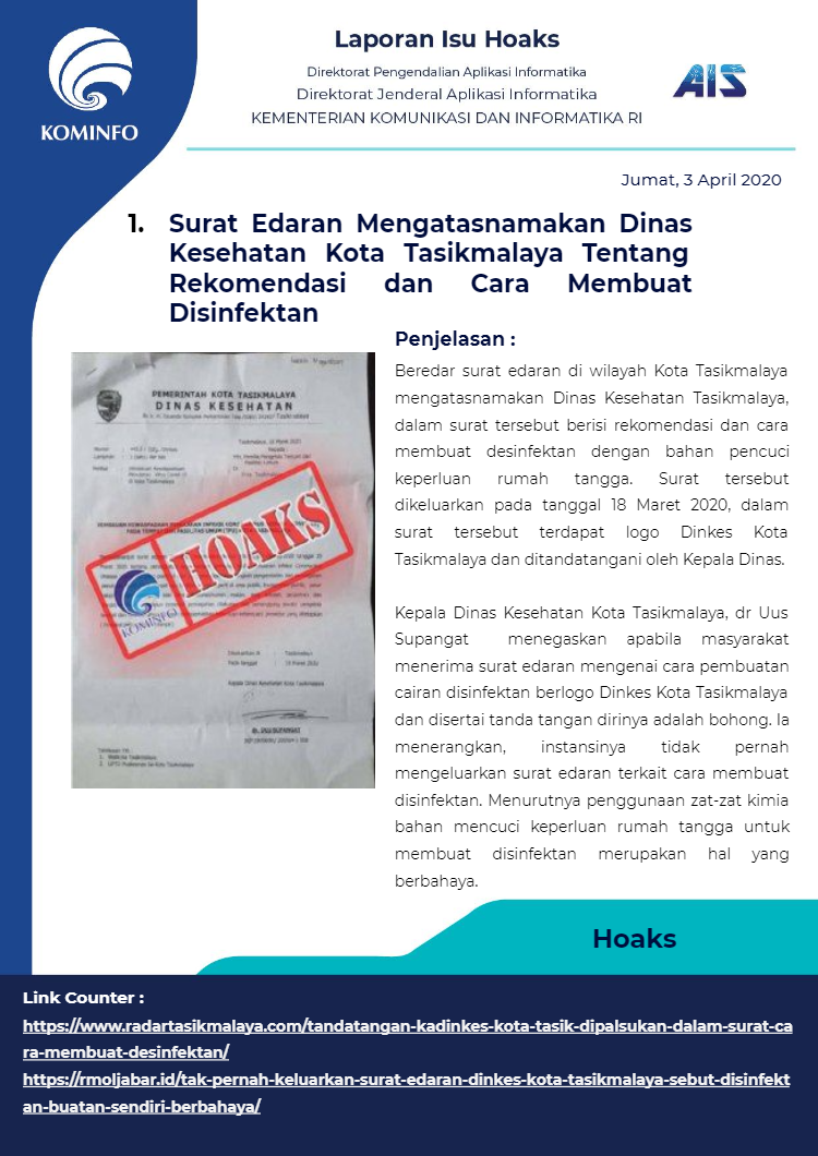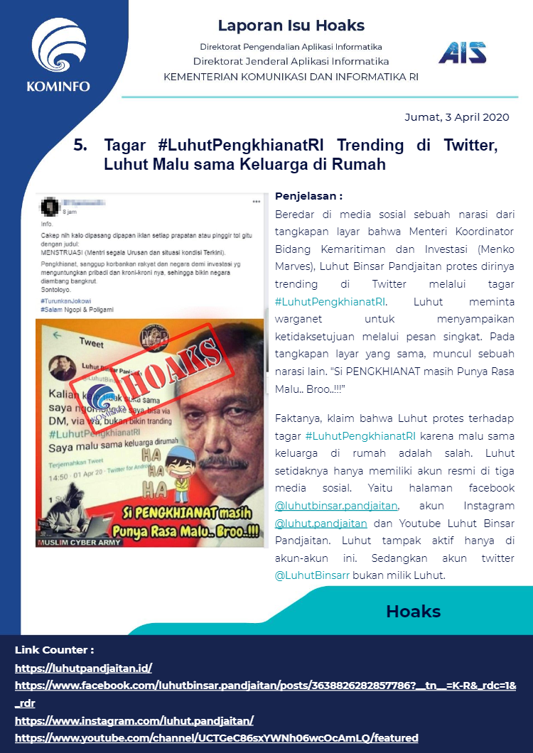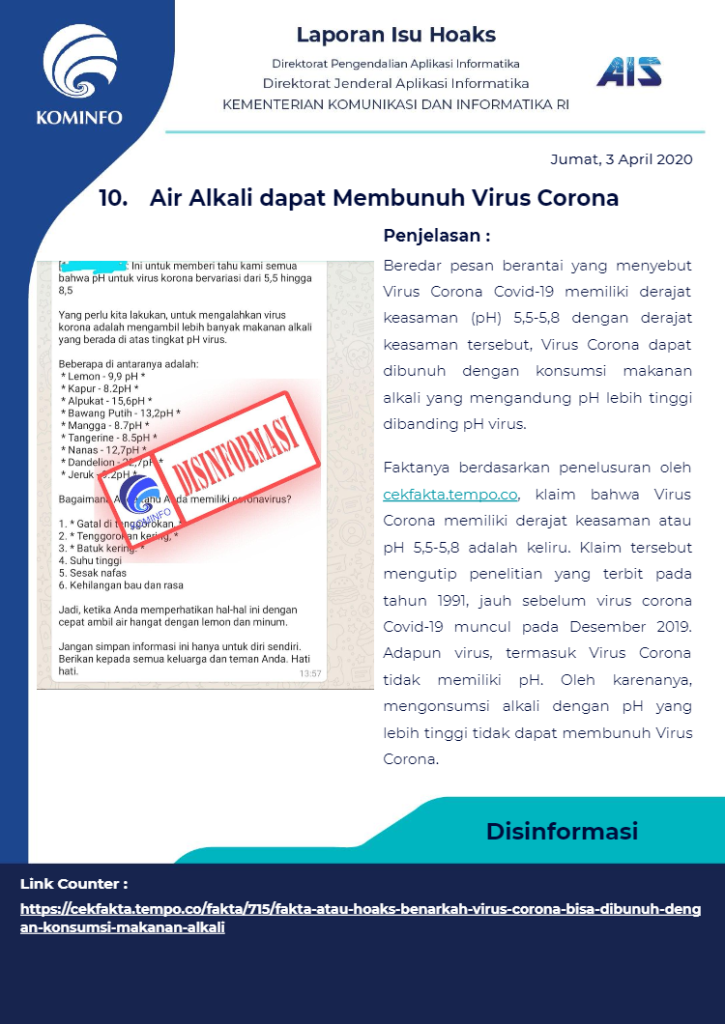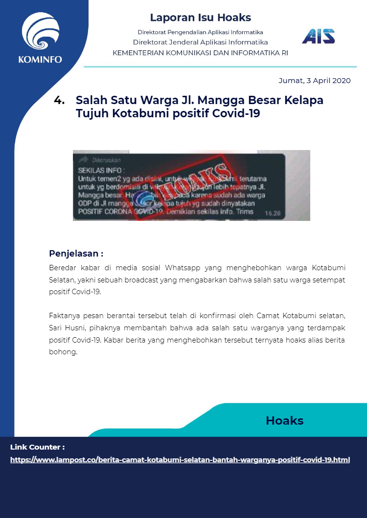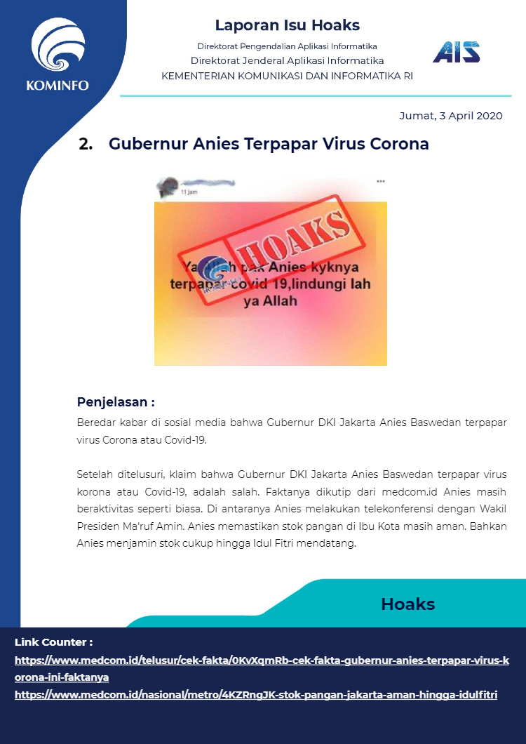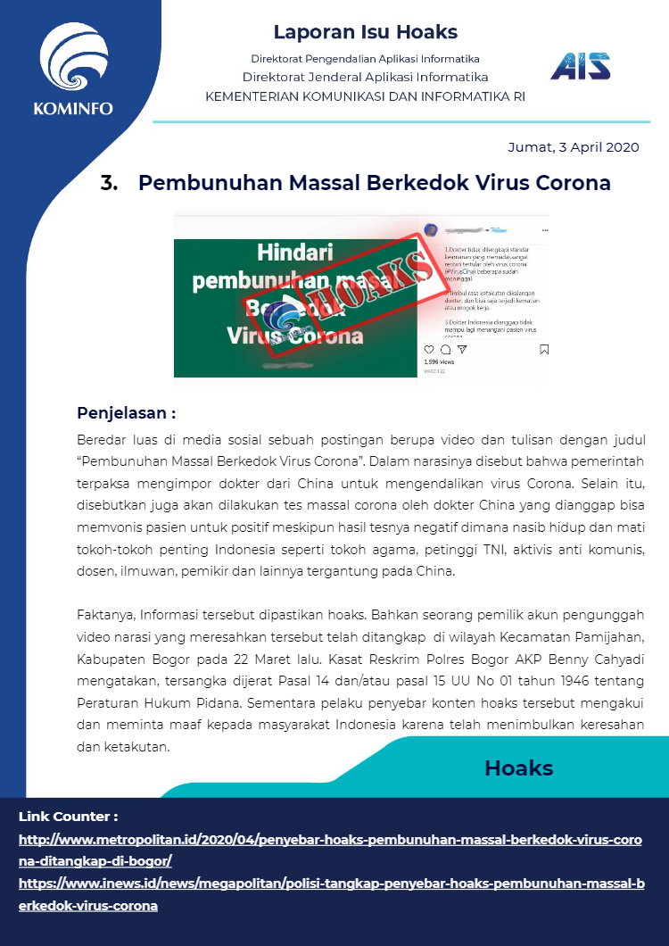 Berikut rangkuman Isu Hoaks Maret 2020 yang dipublikasikan oleh Kominfo Republik Indonesia :