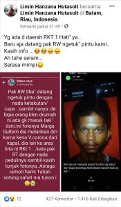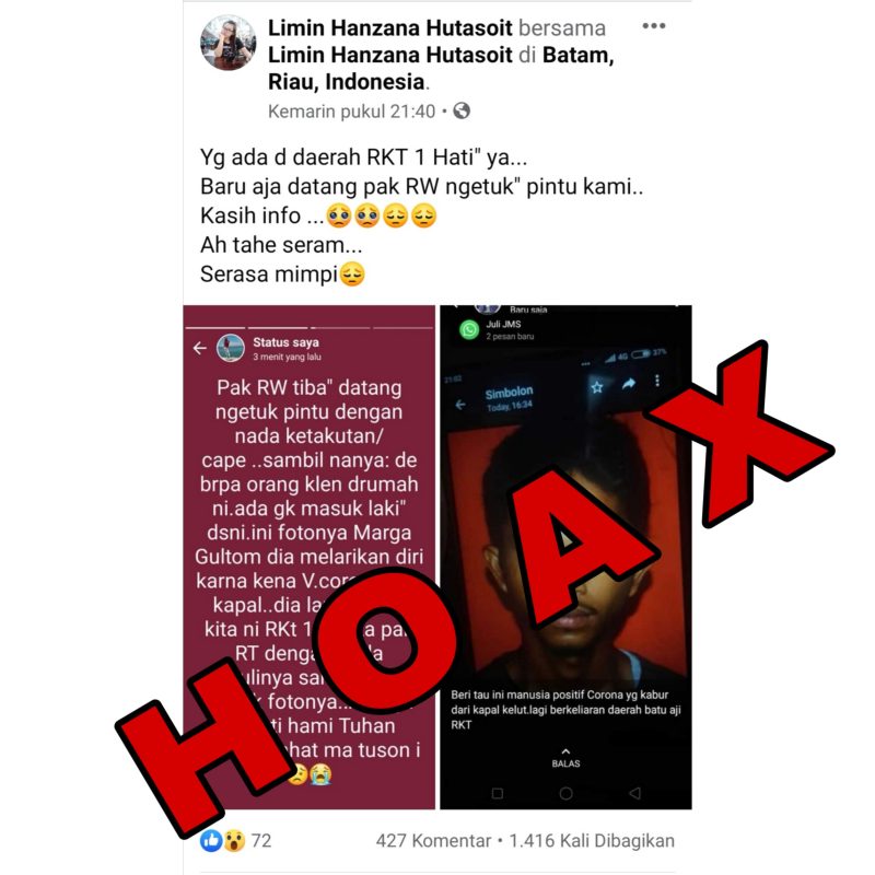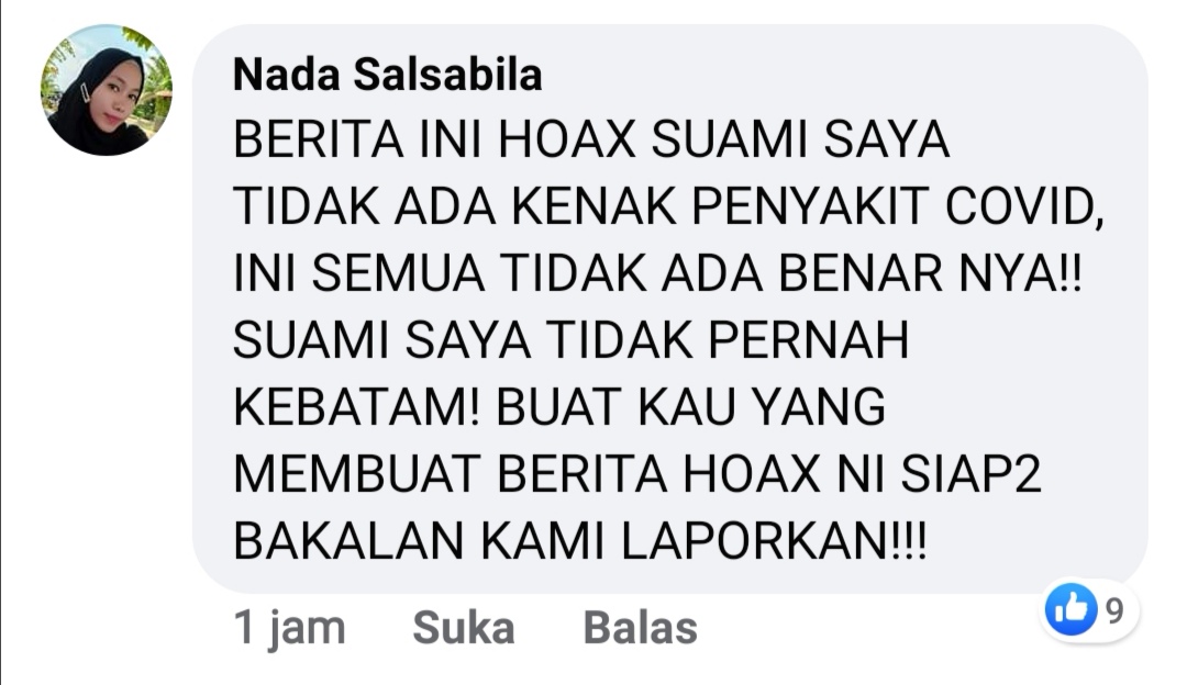 Akun Facebook Nada Salsabila, dalam komentarnya mengatakan bahwa foto yang dibagikan oleh Limin Hanzana Hutasoit adalah suaminya, dan suaminya itu tidak terpapar Covid-19. Bahkan, suaminya tidak pernah menginjakkan kaki ke Batam.