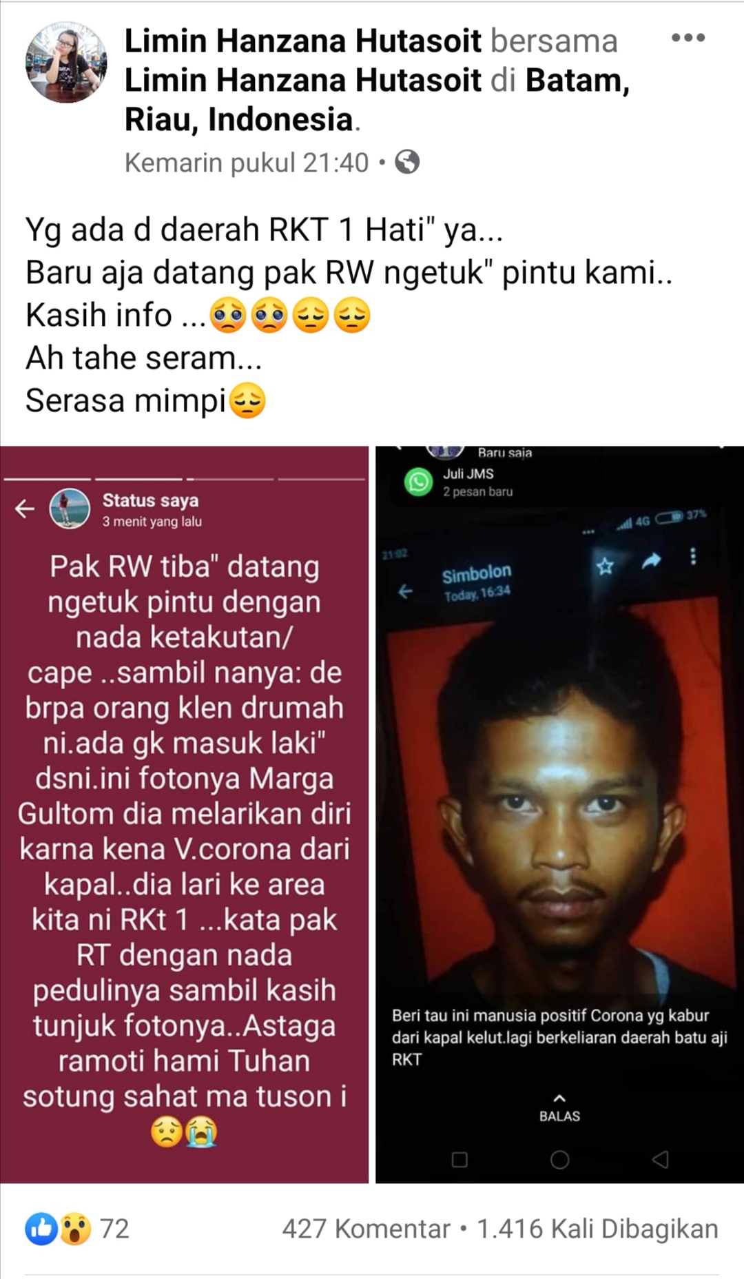 Batam, inikepri.com – Pengguna Facebook Batam heboh, karena informasi adanya pasien Corona yang kabur dari KM Kelud, dan berkeliaran di RKT 1, Batu aji, Batam.