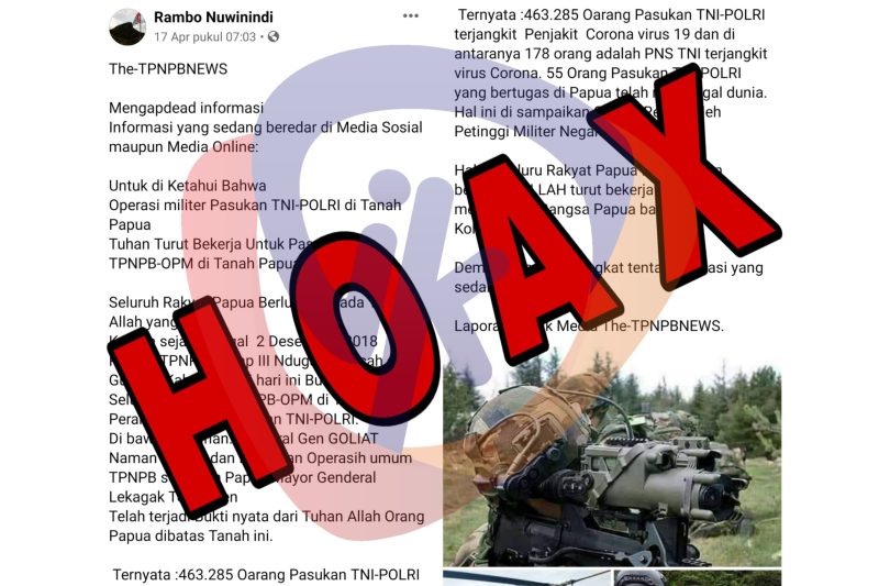 “Ternyata 463.285 Orang Pasukan TNI-POLRI terjangkit Penjakit Corona virus 19 dan di antaranya 178 orang adalah PNS TNI terjangkit virus Corona. 55 Orang Pasukan TNI-POLRI yang bertugas di Papua telah meninggal dunia akibat Covid-19. Hal ini di sampaikan Secara Resmi oleh Petinggi Militer Negara Indonesia. Hal ini Seluruh Rakyat Papua Berlutut dan berpuasa ALLAH turut bekerja keras melepaskan Bangsa Papua barat dari tangan Kolonial NKRI. Demikian laporan singkat tentang situasi yang sedang terjadi. Laporan : Awak Media The-TPNPBNEWS.” tulis akun tersebut.