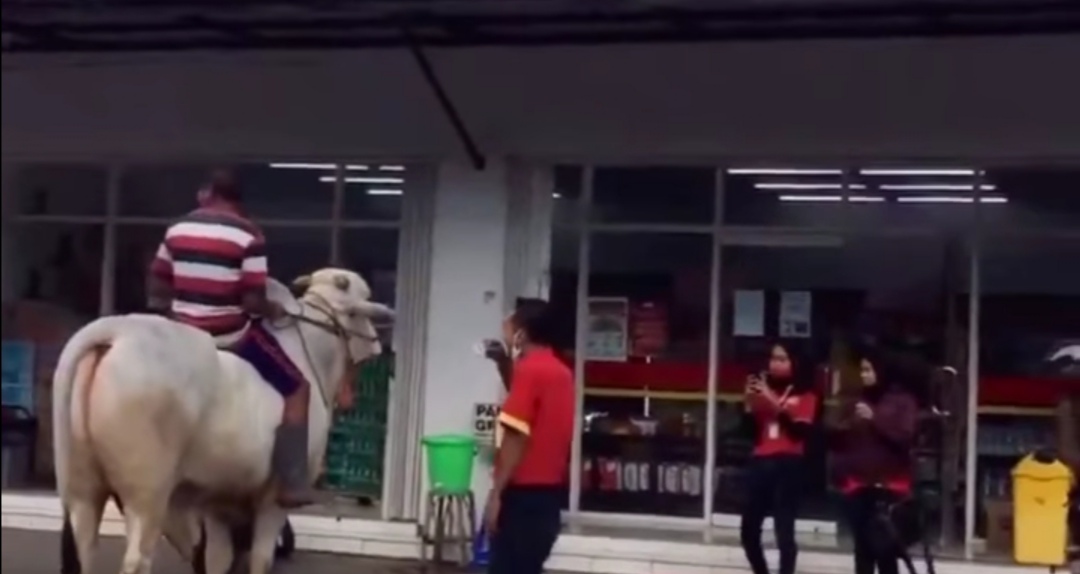 Magetan, inikepri.com – Sebuah unggahan memperlihatkan seorang pria yang berbelanja ke sebuah minimarket dengan mengendarai seekor sapi.