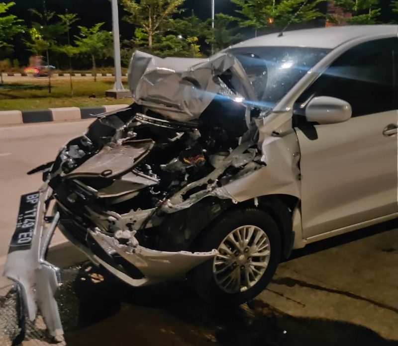 Batam, inikepri.com – Sebuah mobil berplat nomor BP 1748 EO ringsek dibagian depannya karena menghantam sebuah lori.