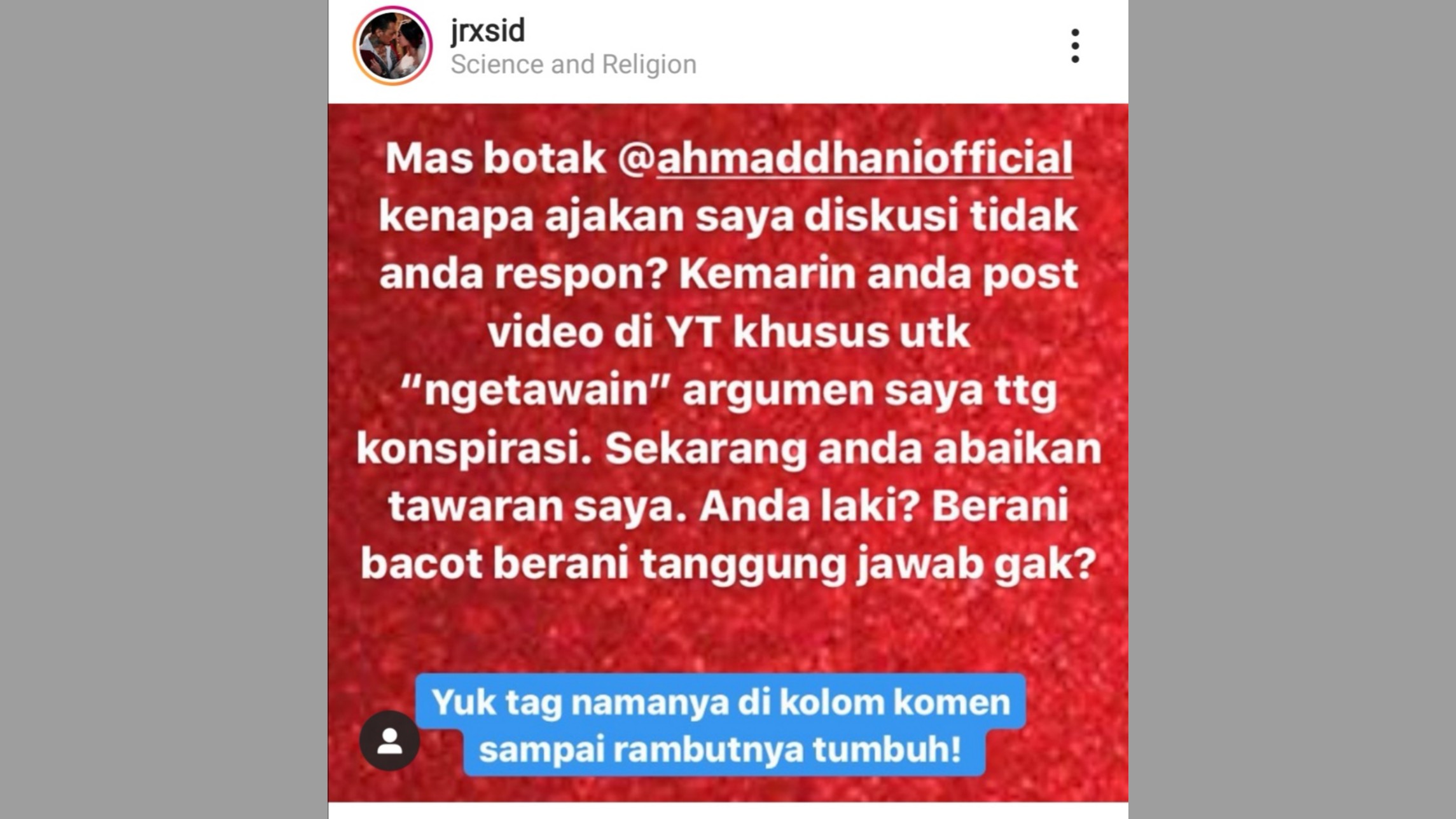 “Saya menantang Anda @ahmaddhanioffcial untuk diskusi tentang konspirasi di live Instagram,” ungkap Jerinx SID di akun @jrxsid, Jumat (08/05), dilansir dari jpnn.