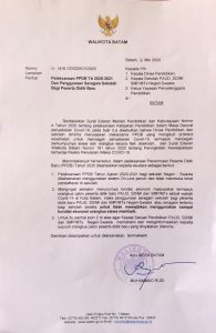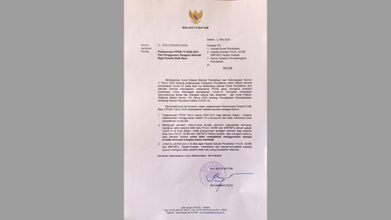 Surat yang di keluarkan tanggal 8 Mei 2020 tersebut ditunjukkan kepada Kepala Dinas Pendidikan, seluruh Kepala Sekolah PAUD, SD/MI, SMP/MTs negeri dan swasta. Kemudian juga Ketua Yayasan Penyelenggara Pendidikan yang ada di Kota Batam.