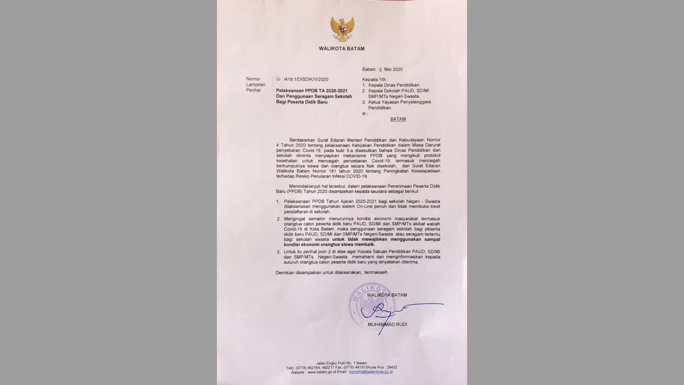 Batam, inikepri.com – Pemerintah Kota (Pemko) Batam mengeluarkan surat edaran terkait pelaksanaan penerimaan peserta didik baru (PPDB) tahun 2020 dan penggunaan seragam bagi peserta didik baru. Surat dengan nomor 16/419.1/DISDIK/V/2020 tersebut ditandatangani langsung oleh Wali Kota Batam, Muhammad Rudi.