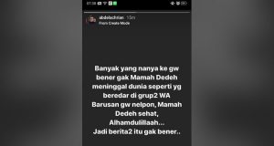 “Banyak yang nanya ke gw bener gak Mamah Dedeh meninggal dunia seperti yg beredar di grup2 WA Barusan gw nelpon, Mamah Dedeh sehat, Alhamdulillaah… Jadi berita2 itu gak bener..” tulis Abdel.