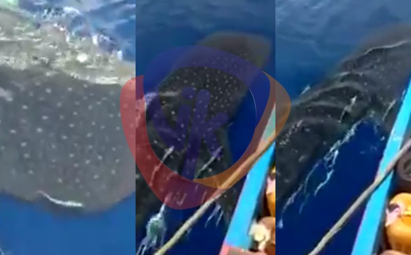 Dalam video berdurasi 30 detik tersebut, tampak ikan hiu paus itu berenang mengitari perahu nelayan.