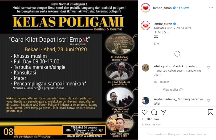 Jakarta, inikepri.com – Baru-baru ini beredar sebuah postingan iklan di Instagram bertajuk Kelas Poligami ‘Cara Kilat Dapat Istri Empat’. Postingan tersebut dibagikan kembali oleh akun gosip @lambe_turah hingga akhirnya viral.