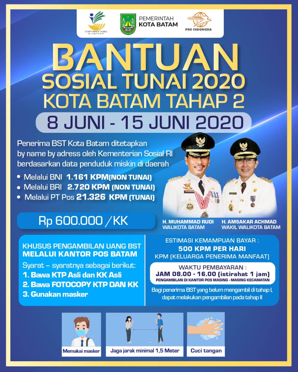 KPM dari enam kelurahan di Kecamatan Batam Kota bisa mengambil BST di Kantor Pos Batam Centre. Dimulai dengan Kelurahan Sukajadi dan Sei Panas pada 8 Juni, dilanjutkan Baloi Permai dan Belian pada 9 Juni, serta Taman Baloi dan Teluk Tering pada 10 Juni.