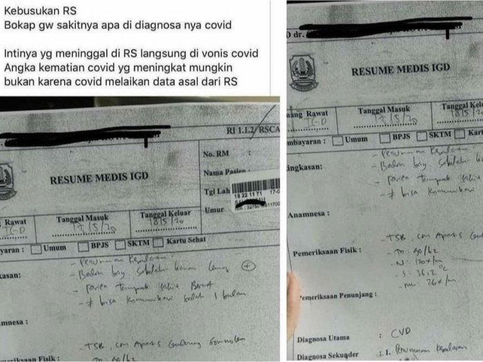 Dia pun membantah ayahnya terinfeksi Covid-19. Pria ini juga mengunggah foto selembar kertas hasil diagnosis. Di kertas tersebut diagnosa utama ayahnya adalah CVD.