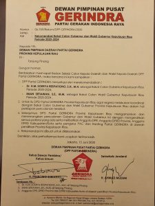Jakarta, inikepri.com – Partai Gerindra resmi merekomendasikan pasangan Soeryo Respationo – Iman Sutiawan sebagai calon gubernur – wakil gubernur Kepulauan Riau pada pilkada serentak Desember mendatang.