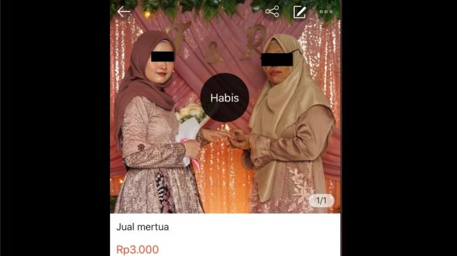 Ia memasang foto si menantu dan mertua yang tengah dalam sebuah rangkaian acara pernikahan. Dalam deskripsi produk iklan tersebut tertulis “Jual mertua” dengan harga Rp3000.