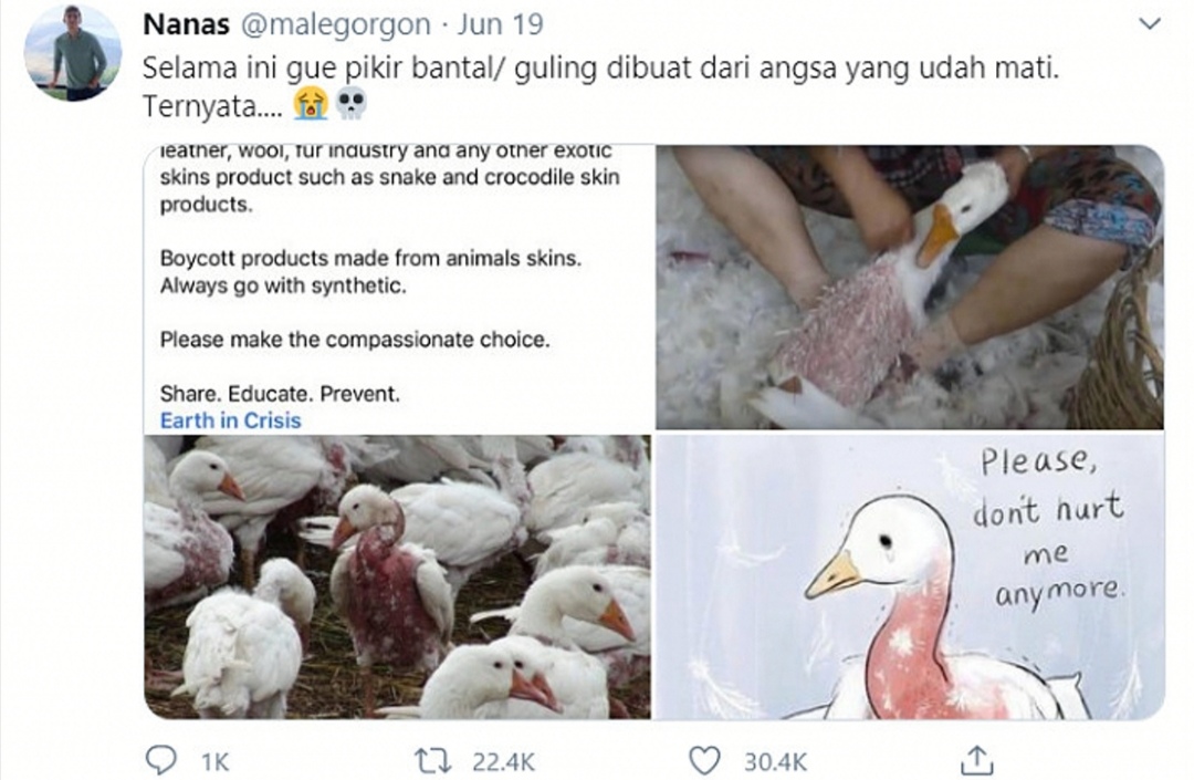 “Ini alasan aku gak mau make jaket/celana/sleeping bag goose down, gak tega akutuh sama angsa-angsa itu. Dan pantes aja harga barang-barang yang berbahan bulang itu mehong ternyata diambil dari angsa yang masih hidup,” kata @Ayu_Ke**ting.