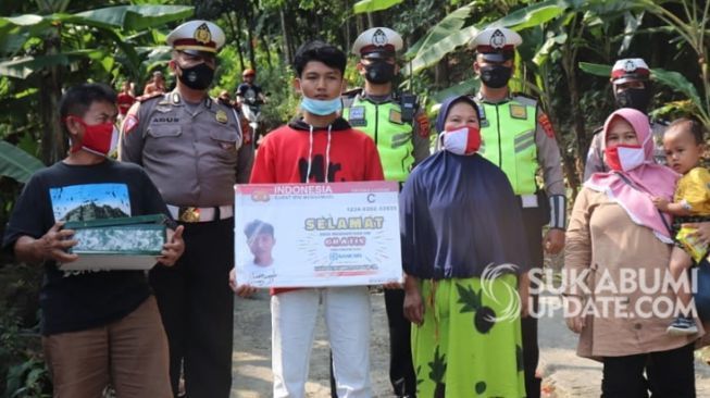Ketika kotak di sobek, Restu diminta untuk membaca tulisan di dalamnya yang ternyata berisi kalimat “Selamat Anda mendapatkan SIM gratis”.