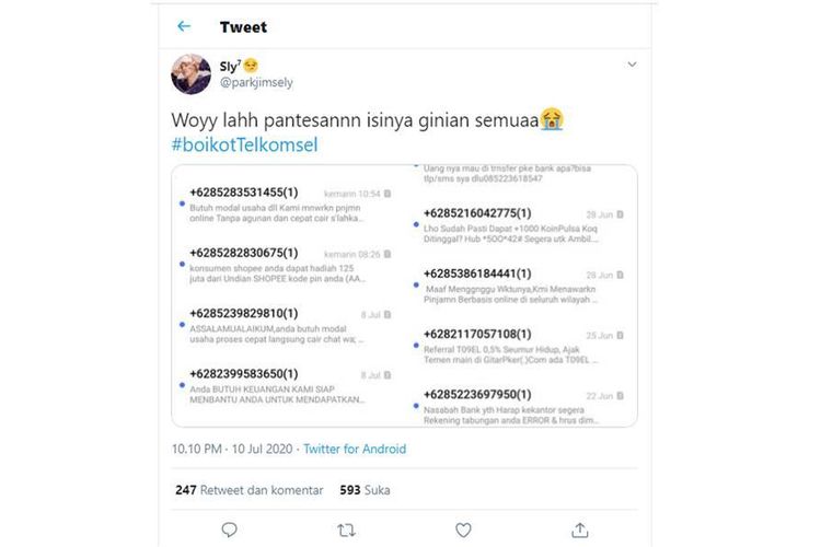 Dari tagar tersebut banyak yang membicarakan mengenai nomor pelanggan Telkomsel yang sering mendapat sms dari nomor tidak dikenal.