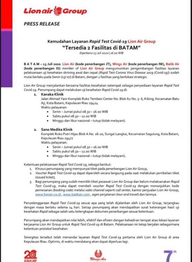 Lion Air memberikan tarif rapid tes Rp 95.000, sudah termasuk surat keterangan sesuai hasil dengan masa berlaku 14 hari.