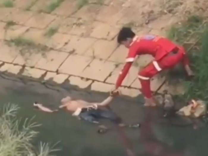 Saat itu, warga berkerumun melihat petugas yang sedang berupaya melakukan evakuasi seorang pria yang tampak tidak bergerak di aliran sungai. Petugas berbaju merah yang nampaknya bukan di Indonesia itu pun coba mendekati sesosok pria tersebut dan berupaya mengevakuasinya ke atas.