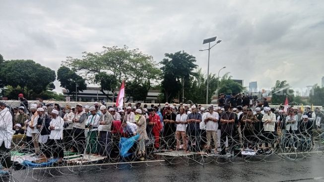 Di tengah situasi ramai dan pekikkan suara demonstran, mereka menghentikan sejenak kegiatannya untuk melaksanakan salat zuhur berjamaah. Kelompok tersebut menggunakan badan jalan untuk menunaikan ibadah siang. Seluruh prosesi berlangsung khidmat meski hujan perlahan mulai turun.