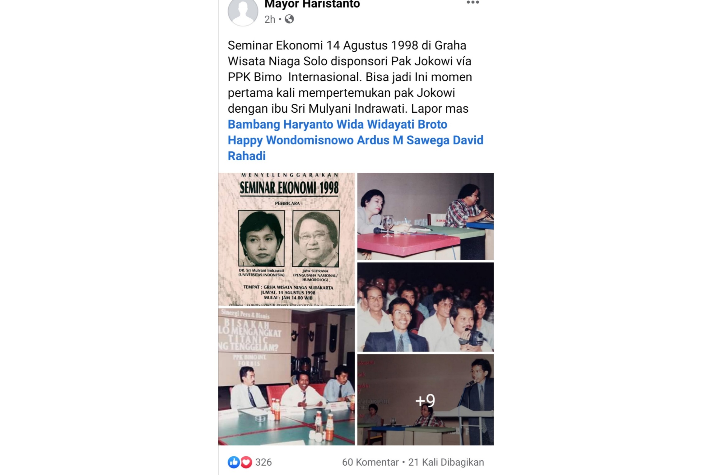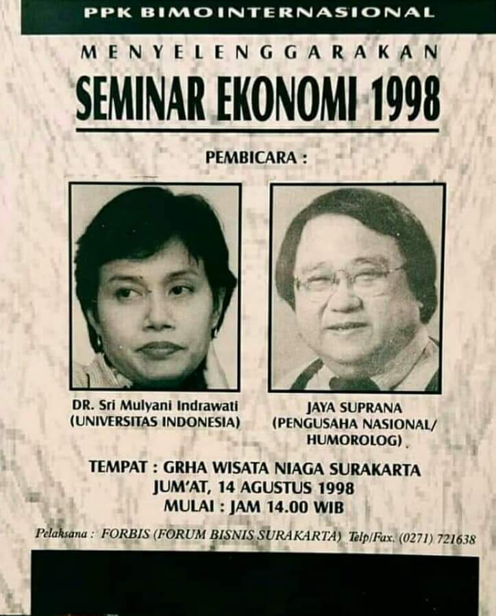 Dalam seminar itu, Jokowi yang masih menjadi pengusaha mebel mengundang Sri Mulyani dan Jaya Suprana.