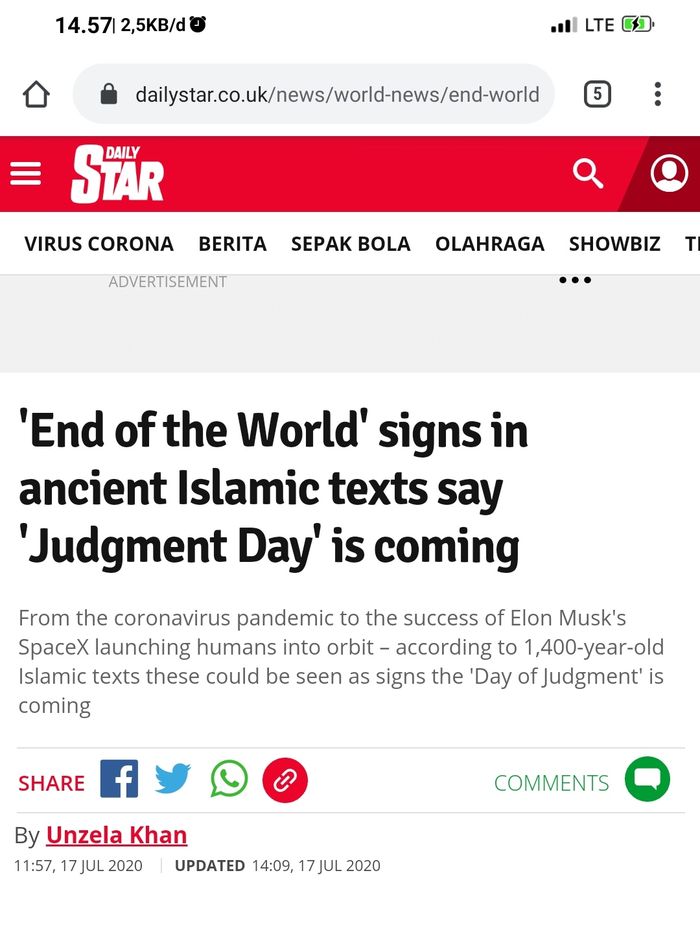 Situs berita Inggris, Daily Star pada Jumat (17/7) menulis sebuah berita dengan judul “End of The World, Signs In Ancient Islamic Text Says Judgement Day, Is Coming”.