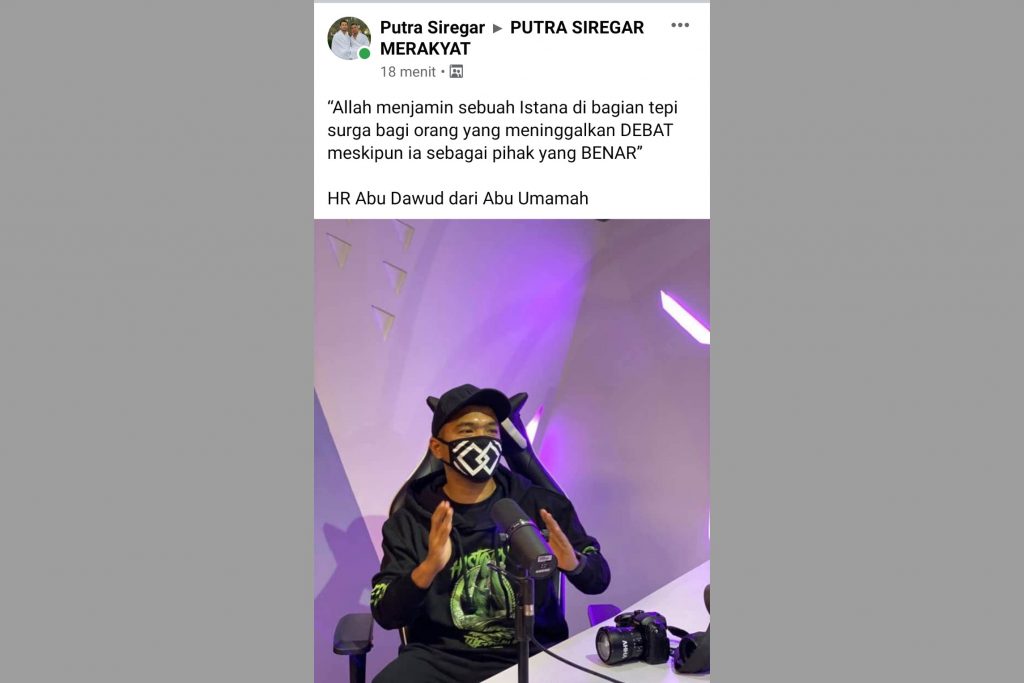 Dalam status yang dibagikan itu, Putra Siregar mengutip sebuah hadist.