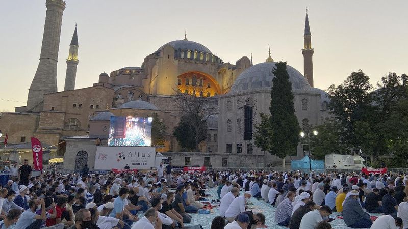 Tidak hanya di dalam, pelataran Hagia Sophia pun dipenuhi jamaah yang melaksanakan ibadah Sholat Id.