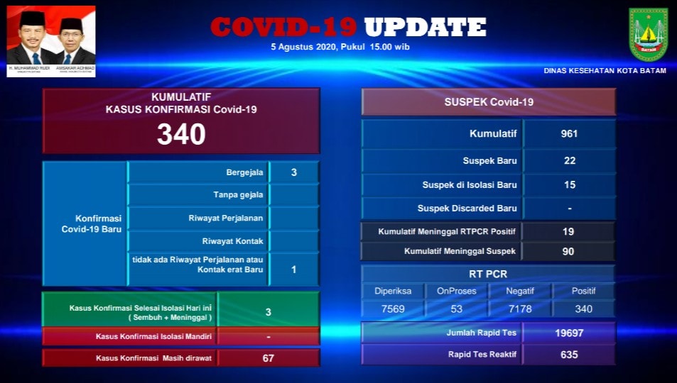 “Data ini merupakan hasil pemeriksaan usap (swab) oleh tim analis BTKLPP Batam, berdasarkan hasil temuan kasus baru di Kota Batam,” kata Ketua Gugus Tugas Batam H Muhammad Rudi (HMR), Rabu (5/8).