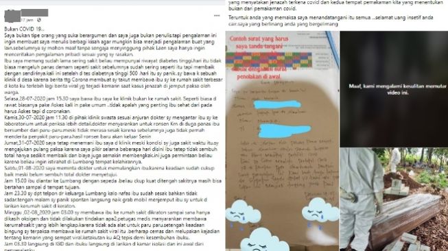 Seperti halnya kejadian yang dikisahkan oleh anak pasien sendiri di laman Facebooknya. Postingan ini dibuatnya bukan untuk menarik simpati dari khalayak warganet, melainkan bentuk protesnya terhadap pihak rumah sakit yang dianggapnya ‘sembarangan’ dalam menetapkan status positif Covid-19 terhadap pasien.