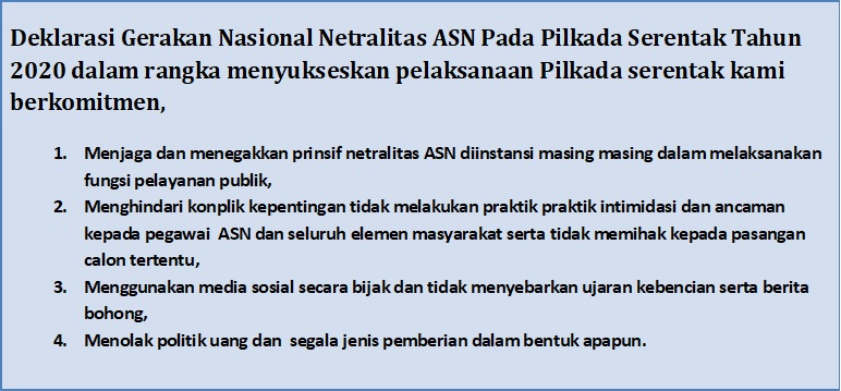 Demikian deklarasi ini kami buat dan dilaksanankan dengan penuh integritas dan rasa tanggung jawab dalam rangka mewujudkan netralitas ASN yang bermartabat beretika dan demokrasi demi terwujudnya persatuan dan kesatuan NKRI.