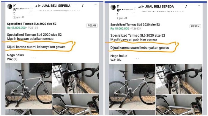 “Dijual karena suami kebanyakan gowes. Nego halus,” ujar pemilik akun Facebook Nathania Verina dalam unggahannya.
