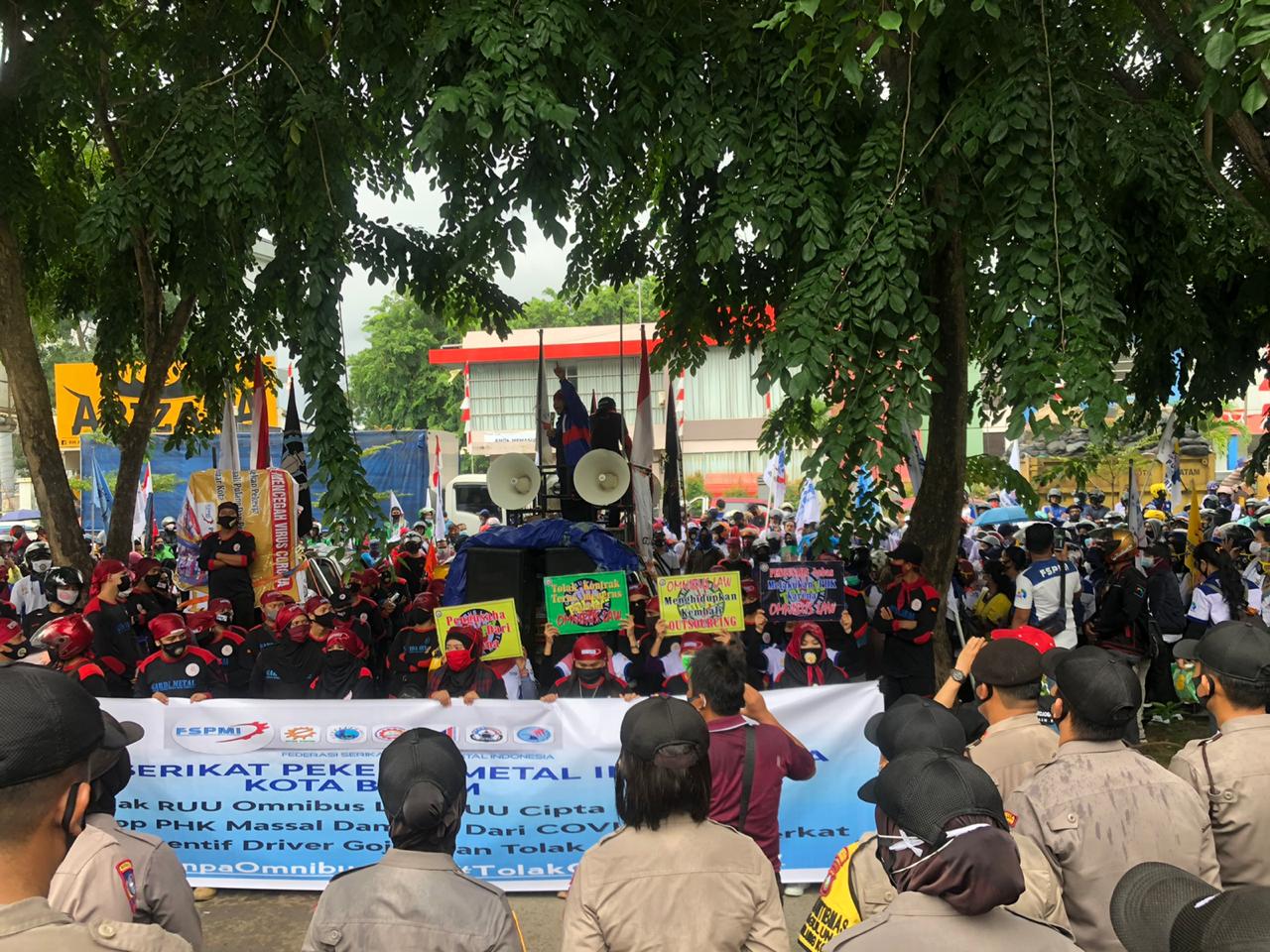 Batam, inikepri.com – Ketua Federasi Serikat Pekerja Metal Indonesia (FSPMI) Cabang Batam, Alvitoni, menyatakan bahwa aksi demo dari ratusan pekerja buruh dan Gojek di depan Gedung Graha Kepri, Selasa (25/8), merupakan aksi nasional yang diselenggarakan serentak.