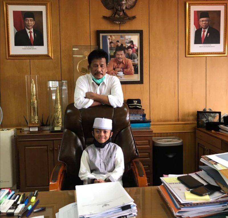 Pada kesempatan tersebut, Rudi dengan senang hati mempersilahkan Hasbi duduk di kursi kerjanya. Hasbi yang awalnya malu-malu akhirnya mencoba menjadi ‘walikota’. Tangannya terlihat sesekali melihat-lihat surat di atas meja walikota.