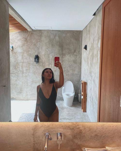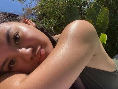 Di sini ia hanya mengenakan bikini hitam dan memperlihatkan tubuh bagian belakangnya. Suasananya bikin mau liburan enggak sih?
