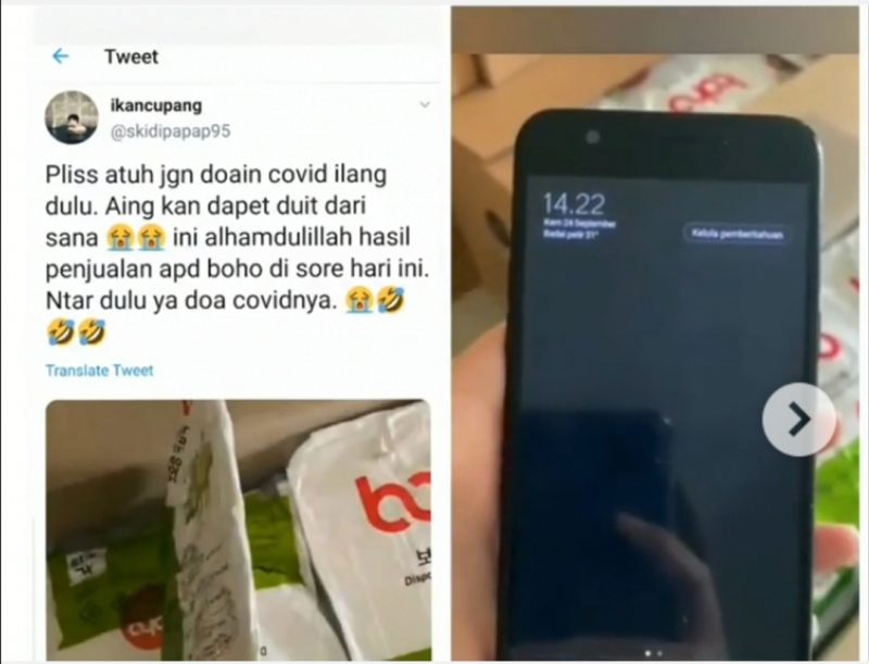 “Pliss atuh jangan doain Covid-19 hilang dulu. Aing (saya) kan dapet duit dari sana. Oni alhamdulillah hasil penjualan APD Boho di sore hari ini. Nanti dulu ya doa Covidnya,” cuitnya seperti dikutip Sabtu 26 September 2020.