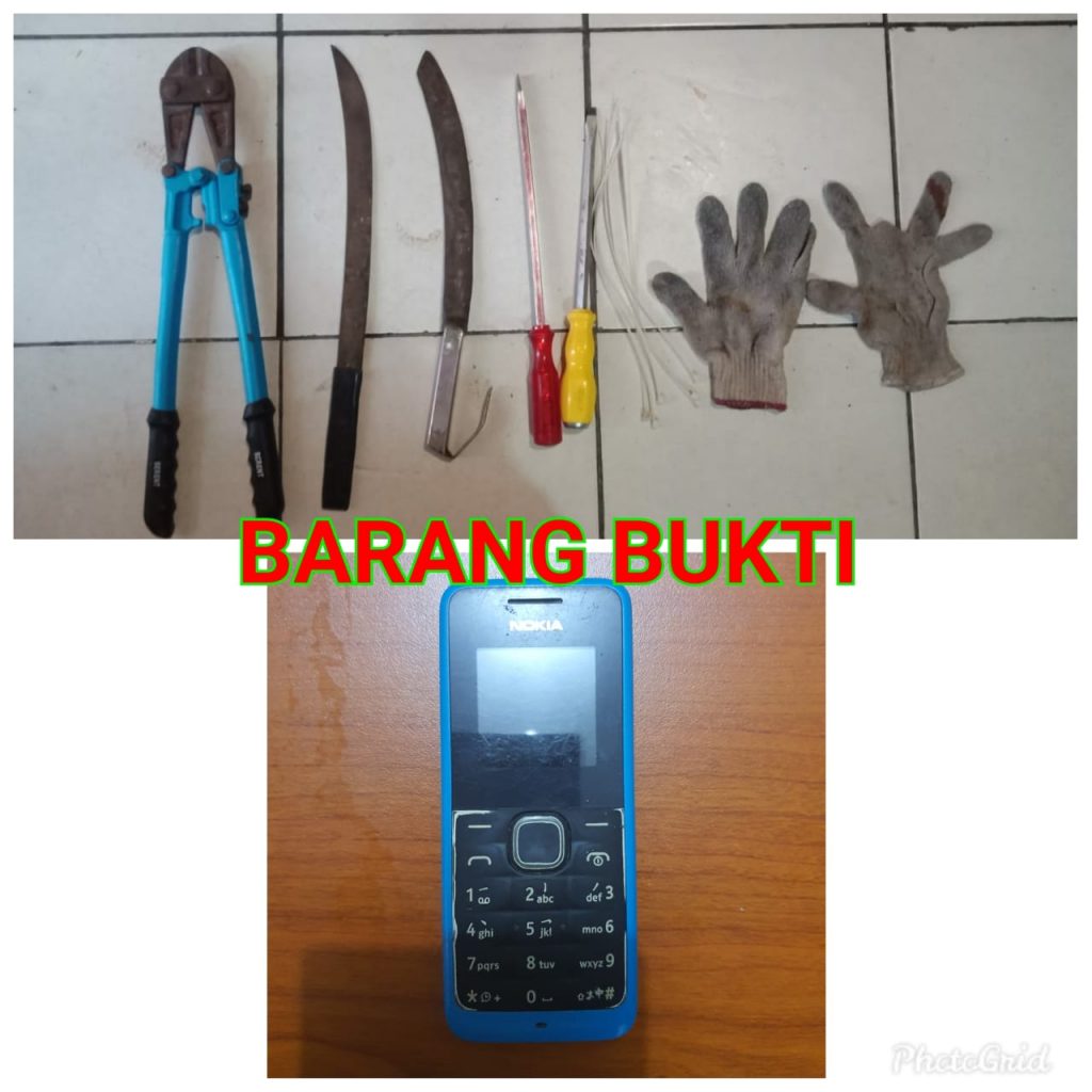 Sedangkan Barang Bukti yang di amankan , 1 (Satu) unit Handphone Nokia Senter (Milik Korban), 1 (Satu) Buah Pemotong/Gunting Besi, 2 (Dua) Buah Parang, 2 (Dua) Buah Obeng, 4 (Enam) Buah Kabel Tie, 1 (Satu) Pasang Sarung Tangan.