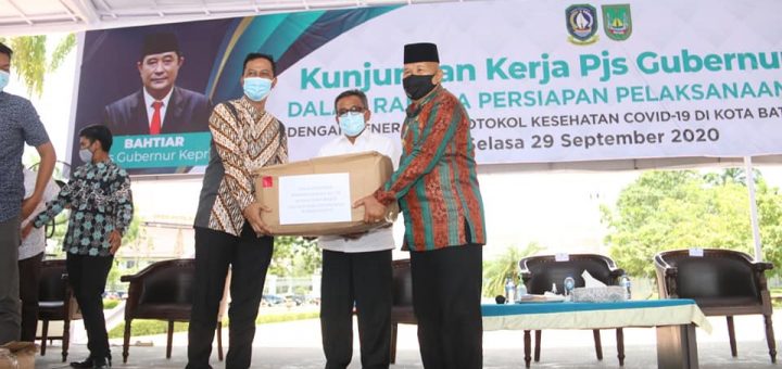 Batam, inikepri.com – Pejabat sementara (Pjs) Wali Kota Batam Syamsul Bahrum didampingi Sekretaris Daerah (Sekda) Kota Batam Jefridin Hamid menyerahkan 24 ribu masker untuk 12 kecamatan se-Kota Batam di Panggung Utama Dataran Engkuputri, Kamis (1/10/2020). Dari jumlah tersebut, artinya setiap kecamatan mendapatkan masing-masing 2 ribu lembar masker.