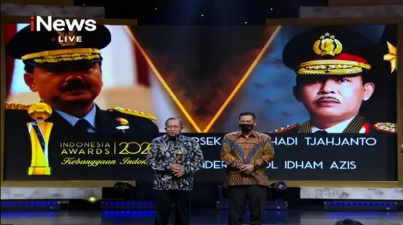 Jakarta, inikepri.com – Panglima TNI Marsekal TNI Hadi Tjahjanto dan Kapolri Jenderal Pol Idham Azis meraih Penghargaan Tokoh Publik pada Indonesia Awards 2020. Ajang penghargaan untuk tokoh dan lembaga pemerintah dan nonpemerintah yang berdedikasi membangun negeri ini disiarkan secara langsung dari MNC Conference Hall, iNews Tower, MNC Center Kebon Sirih Jakarta pada Rabu (7/10/2020).