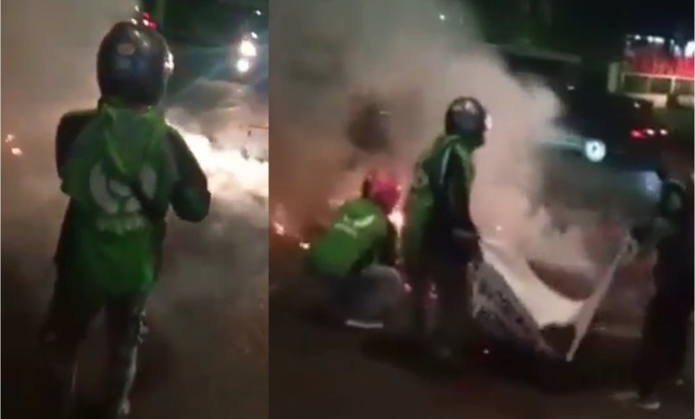 Terlihat dalam video itu, sejumlah pria yang menggunakan jaket hijau khas driver ojol tengah berusaha memadamkan api yang menyala di jalan raya.