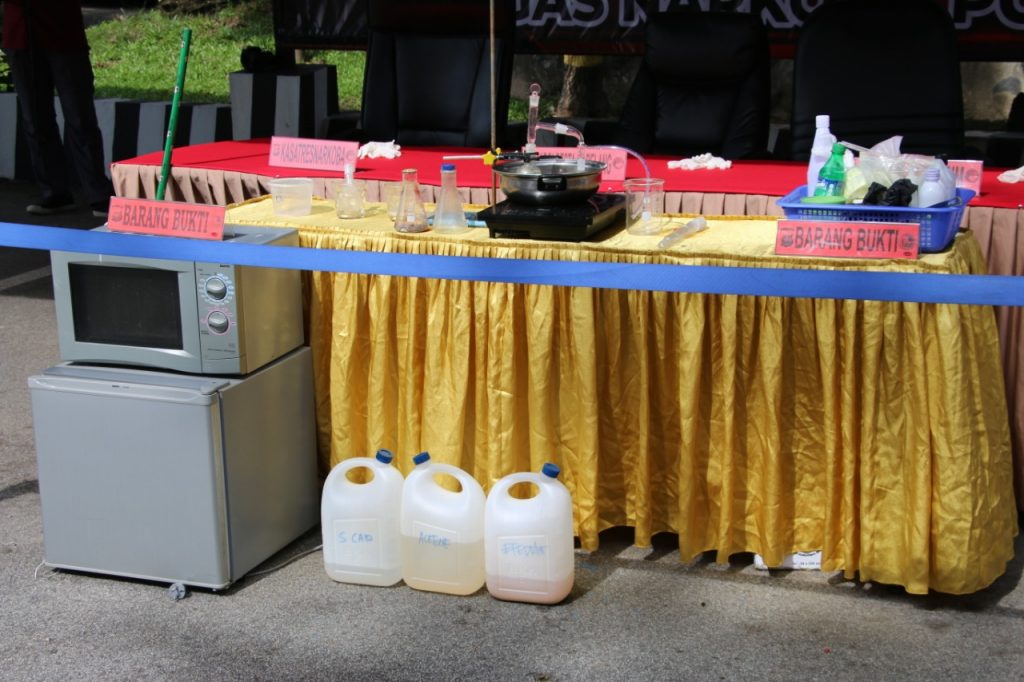Turut diamankan barang bukti berupa 1 buah bungkus sabu seberat 0,15 gram, 1 buah alat hisap sabu (bong), 1 unit peralatan untuk membuat sabu, 1 Unit kompor merk Kris, 1 buah botol kaca warna hijau bertuliskan Meth, 1 buah panci stainless, 2 botol alkohol 70%, 1 lembar kertas kardus yang bertuliskan diduga rumusan zat- zat kimia untuk meracik pembuatan sabu.