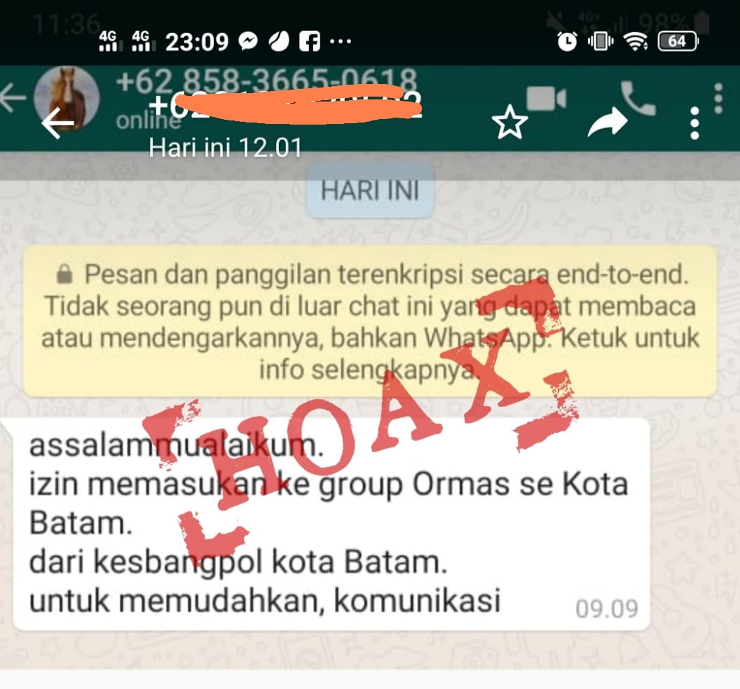 Adapun pesan yang dimaksud Riama ini berasal dari nomor +6285856650618. Isi pesannya sebagai berikut “assalammualaikum. Izin memasukan ke group Ormas se Kota Batam. Dari kesbangpol kota Batam. Untuk memudahkan, komunikasi”.