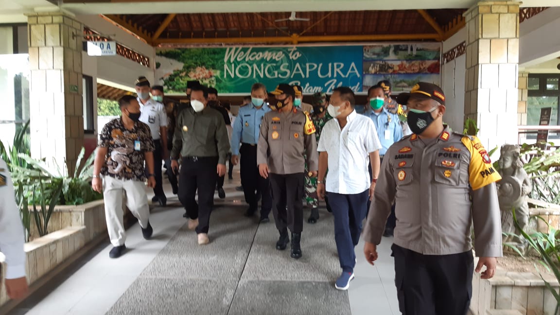 Batam, inikepri.com – Kapolda Kepri Irjen. Pol. Dr. Aris Budiman Bulo, M.Si. Bersama Pjs Gubernur Kepri Bapak Dr. Bachtiar Baharuddin, M.Si Dan FKPD meninjau sarana dan prasarana Penerapan Protokol Kesehatan dalam rangka pencegahan penyebaran Covid – 19 di Pelabuhan Internasional Nongsapura, Kota Batam. Selasa (20/10/2020) sekira pukul 14.40 WIB.